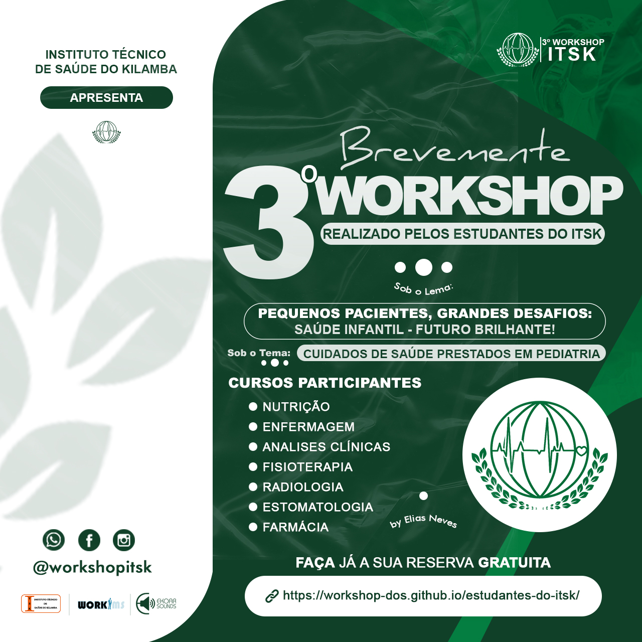 O Instituto Técnico de Saúde do Kilamba nº 7010, foi fundado em 2012, através do Decreto Executivo Conjunto dos Ministérios da Educação, Saúde e Administração do Território Nº 91/12, de 29 de fevereiro de 2012. Tendo como actuais membros da direccção da instituição: Fátima Mambo – Directora, Alice Viegas – Directora Pedagógica e Domingos São Jõao Administrativo. O presente site tem como objectivo trazer informações acerca do Terceiro workshop organizado e dirigidos ...